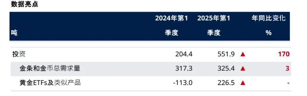 同时,该报告显示,黄金ETF需求复苏,推动一季度黄金投资需求总量增长逾一倍,达552吨,同比增长170%,创下自2022年一季度以来的最高季度水平。全球黄金ETF加速流入,一季度累计流入量达226吨。